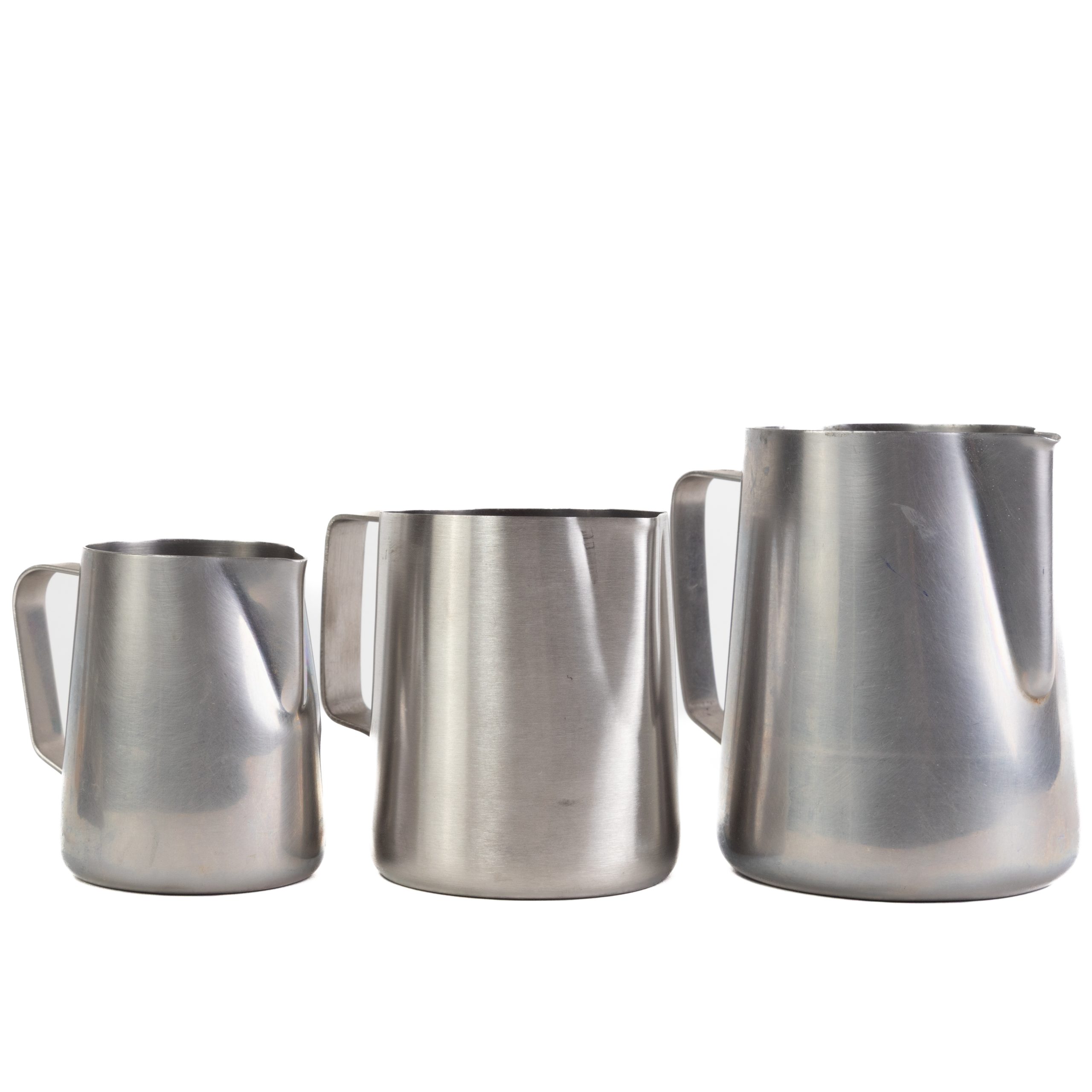 Jarras metálicas para espumar la leche.